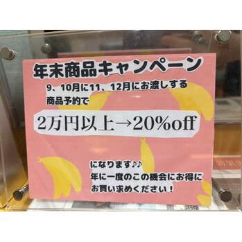 この期間中に商品を2万円以上ご予約いただくと、なんと20%オフになります!商品のお渡しは11月と12月を予定しています。このチャンスをお見逃しなく!